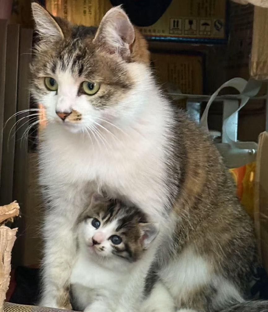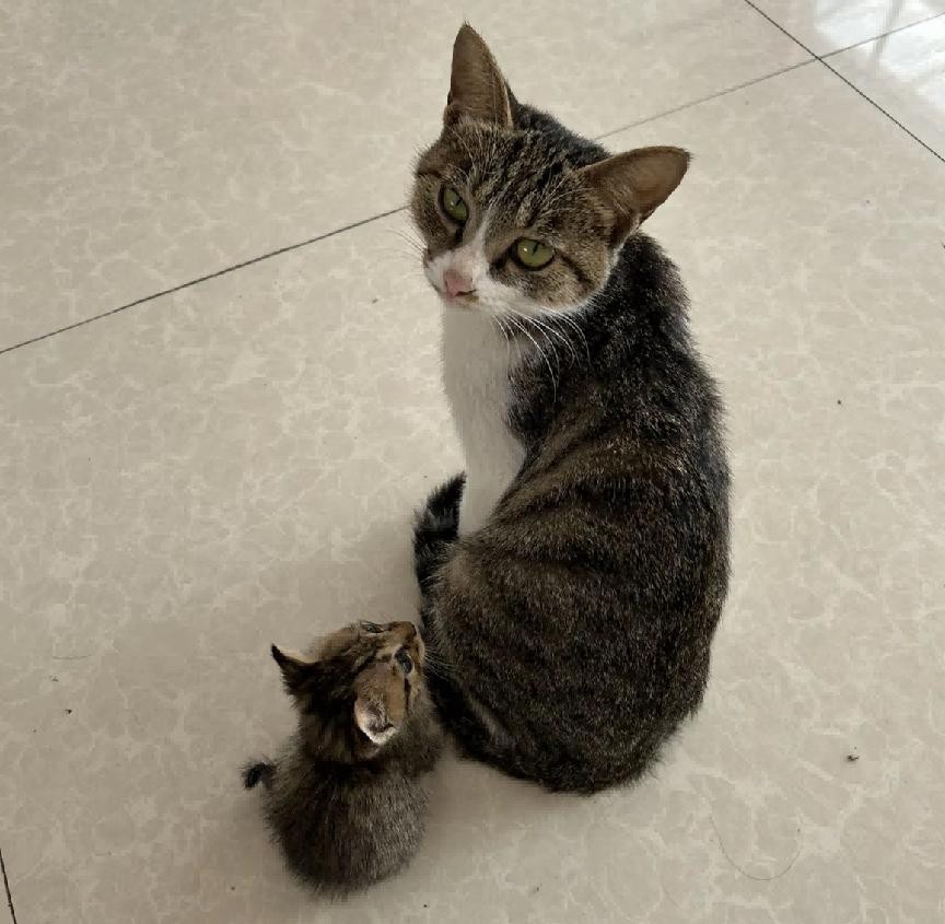 自留款小猫和猫妈妈长得一模一样,一看就是亲生的。